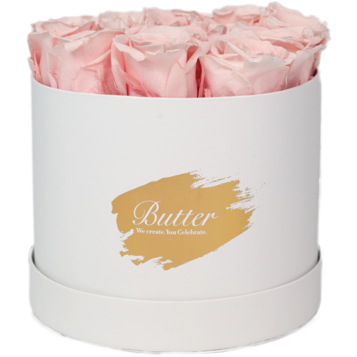 A timeless & elegant arrangement of around 15 forever roses in our classic matte white box.