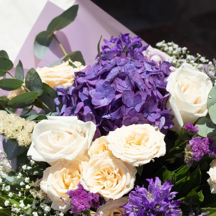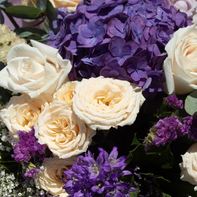 This bag is brimming with joy and sophistication in a poetic way. The cream roses kiss the purple hydrangeas so stunningly! Amethyst is the color of the season. Absolutely perfect for gifting or for placing in a vase in your home.