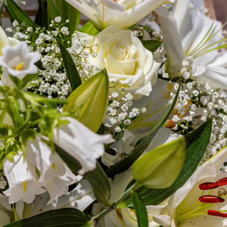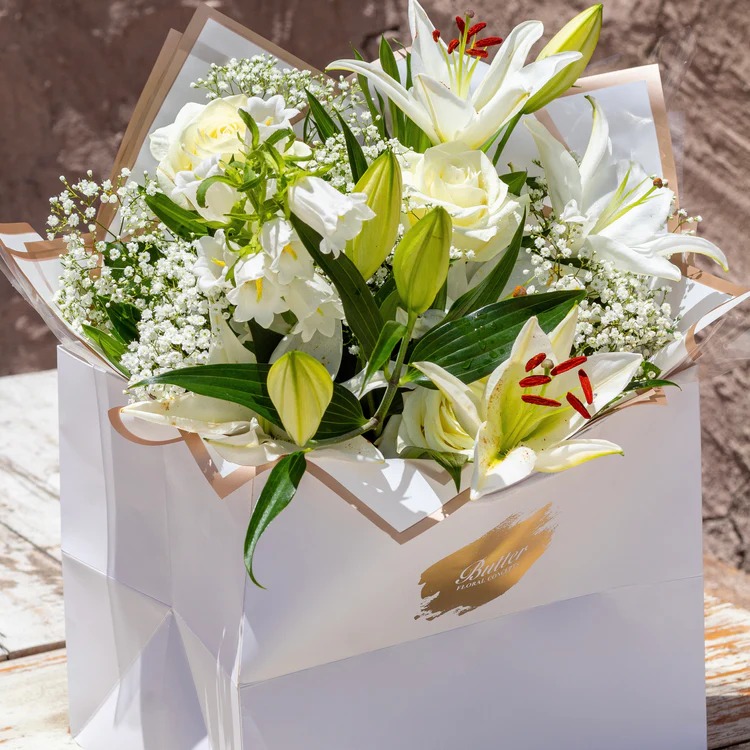 Fresh hand-picked white lilies and roses egantly tied to create an arrangement that exudes utmost beauty and bliss. Delivered in a matte white bag perfect for gifting or placing in a vase in your home. Bouquet photographed is our standard size.