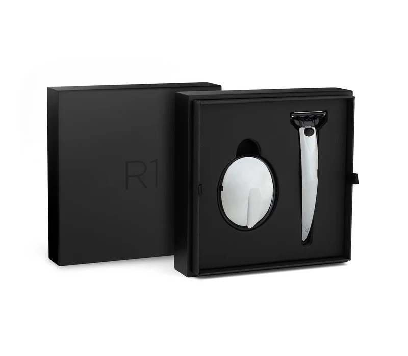 Our R1 razors are fitted with Gillette Mach3 blades, 3 blade technology for a clean shave. The blades also have a lubrication strip to reduce friction when shaving and lock in moisture. The razor has a sleek design and medium weight, making it easy to handle while providing a close shave.
