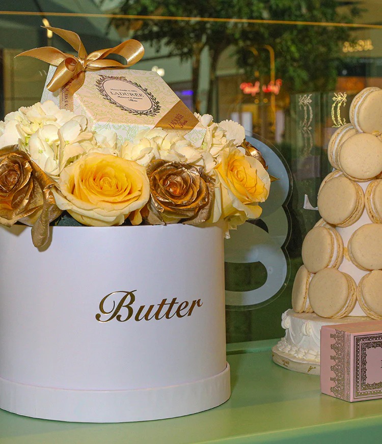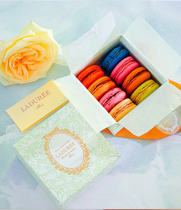 Bringing the belle epoque era to your homes & hearts with our luxury floral gift collaboration with Parisian Macron creators Ladurée. Our matte white hat-box with 24K Gold dusted roses & white roses featuring Ladurée's Arabesque Box. Includes 8 assorted Macrons is sure to be the most scrumptious gift for any celebration.