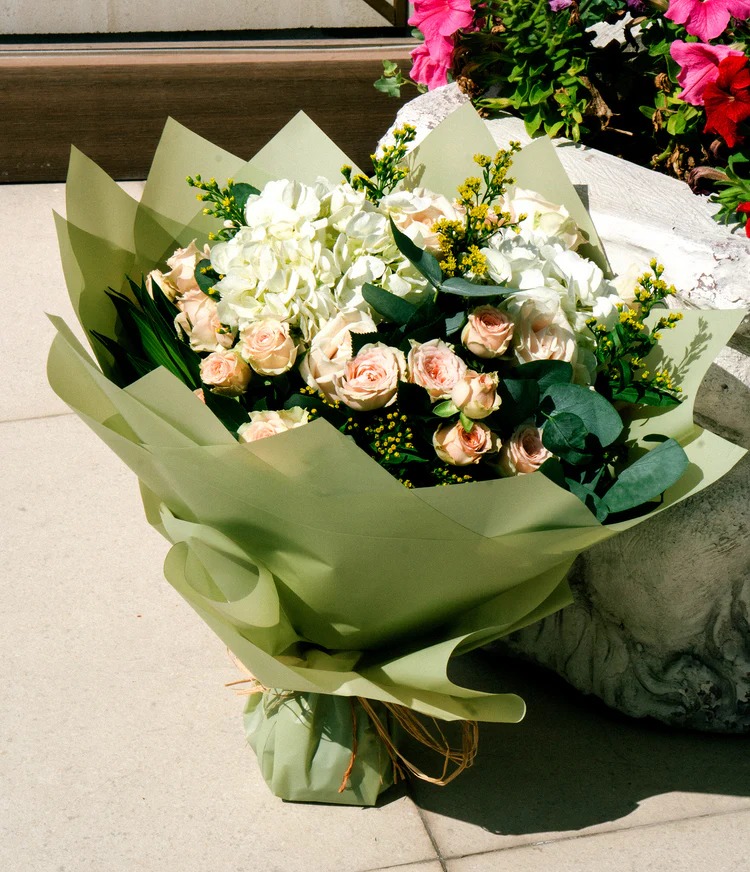 A classic and timeless arrangement to show your appreciation. Freshly cut hydrangeas and roses in pastel hues exude charm & grace.