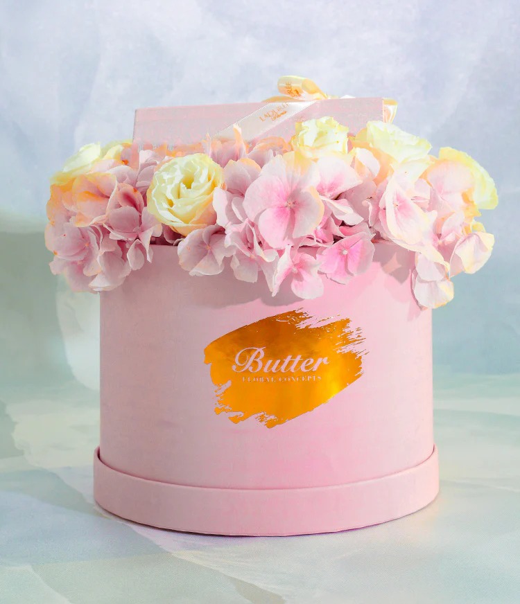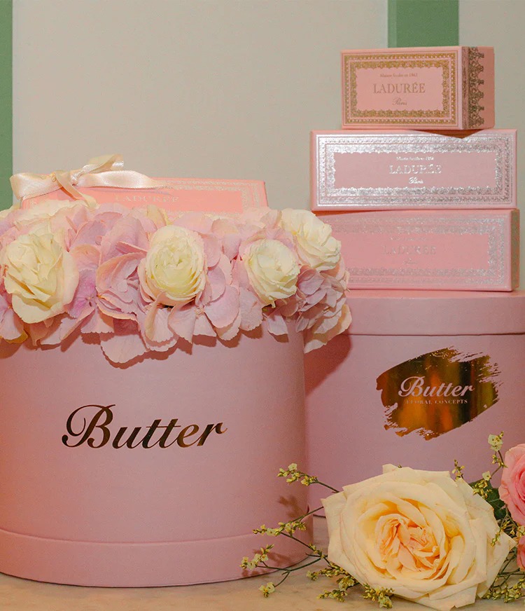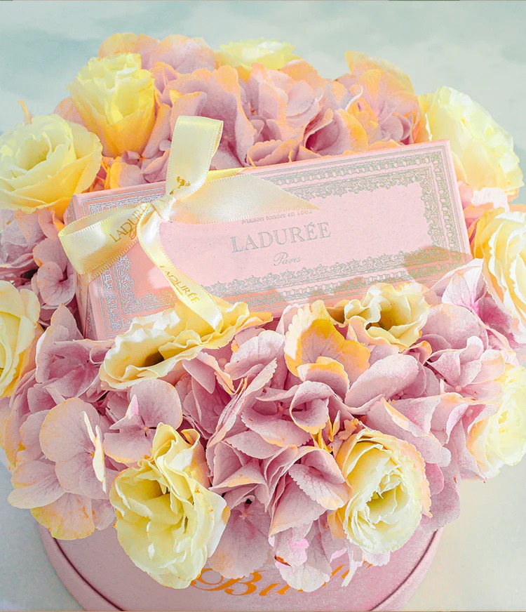 Bringing the belle epoque era to your homes & hearts through our collaboration with Parisian Macron creators Ladurée. Our matte pink hat-box with baby pink hydrangeas and white roses featuring Ladurée's pink Napolean Box with 6 assorted Macrons is sure to be the most scrumptious gift for any celebration.