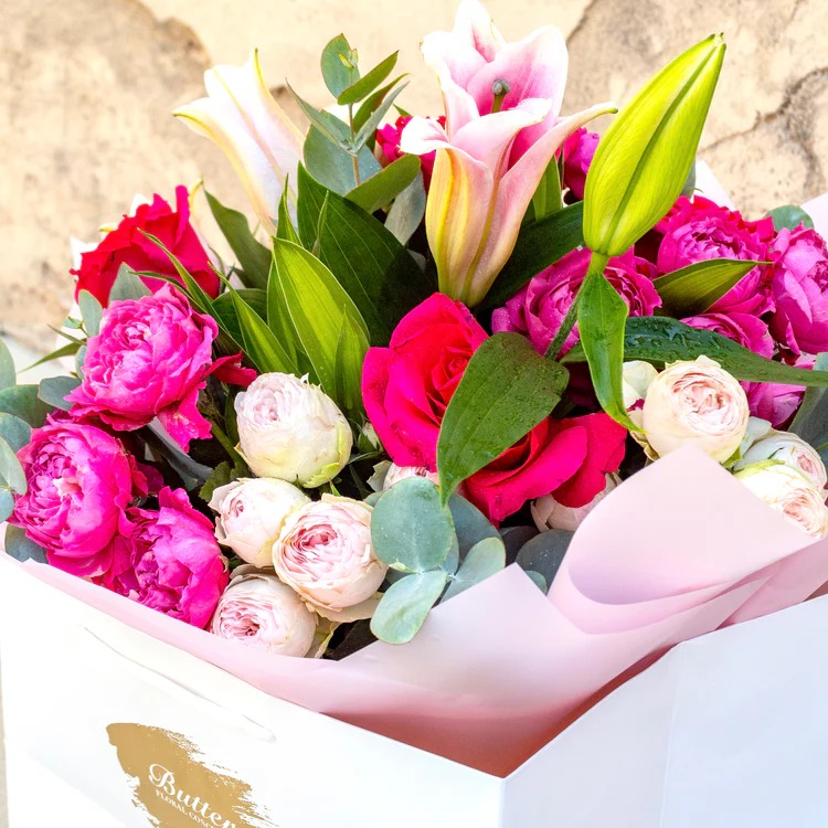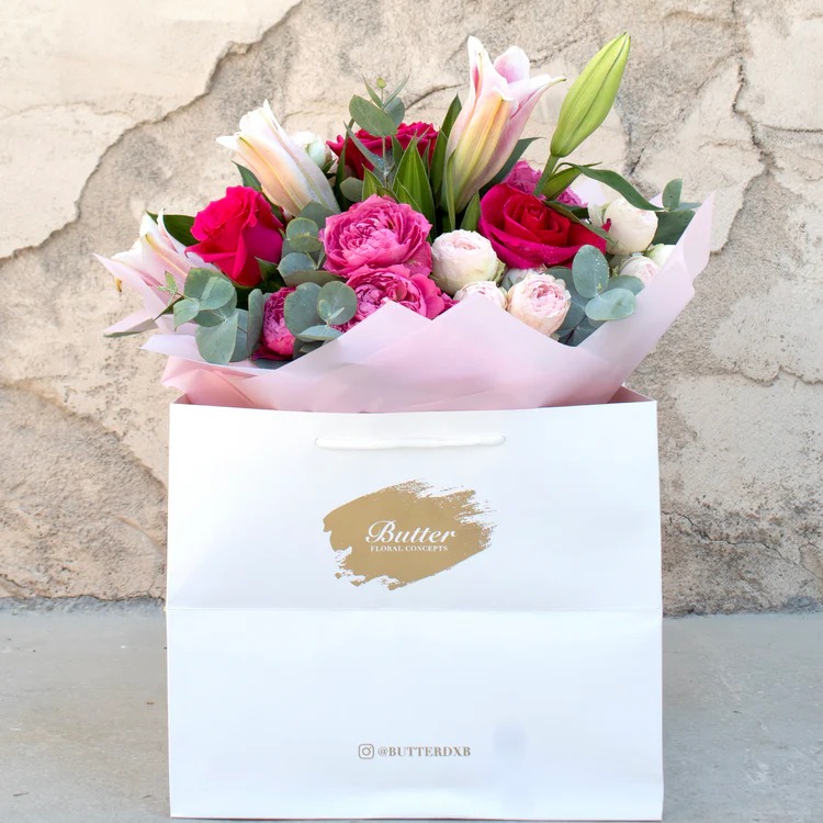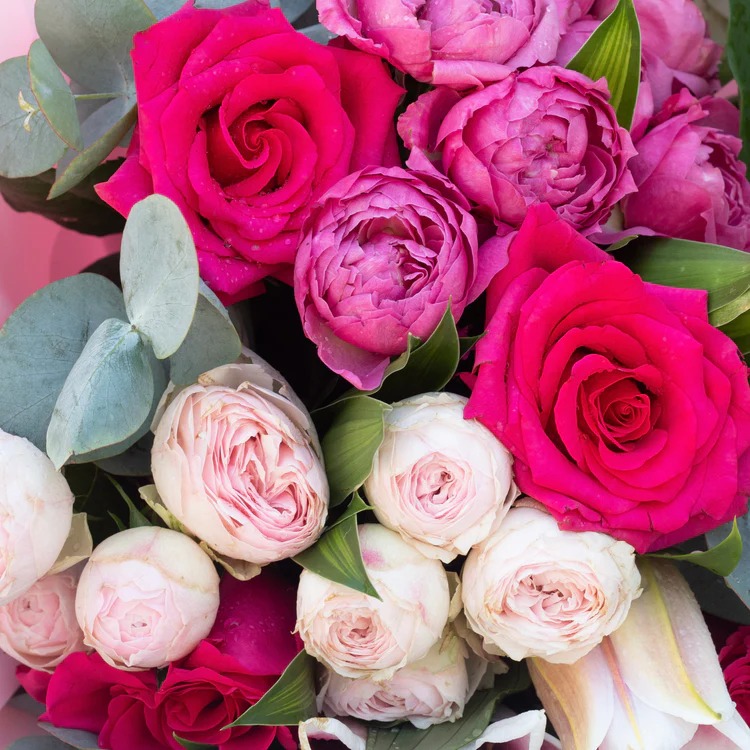An all-pink bouquet of exotic roses and baby peonies. Exudes luxury, class, and timelessness. There's simply never a wrong time to gift this bouquet! Delivered in a matte white bag.