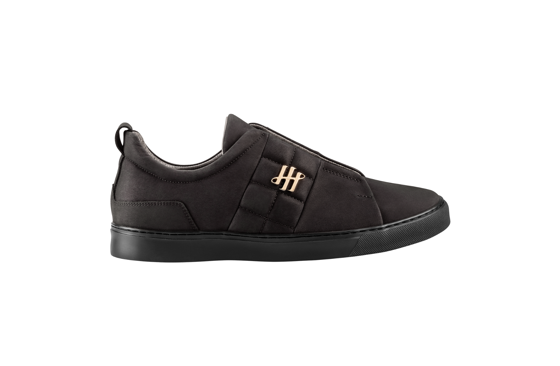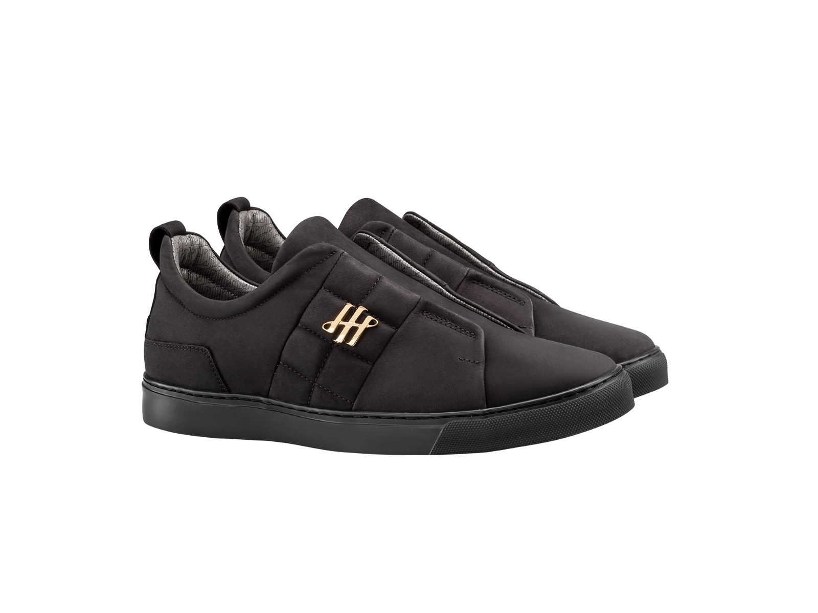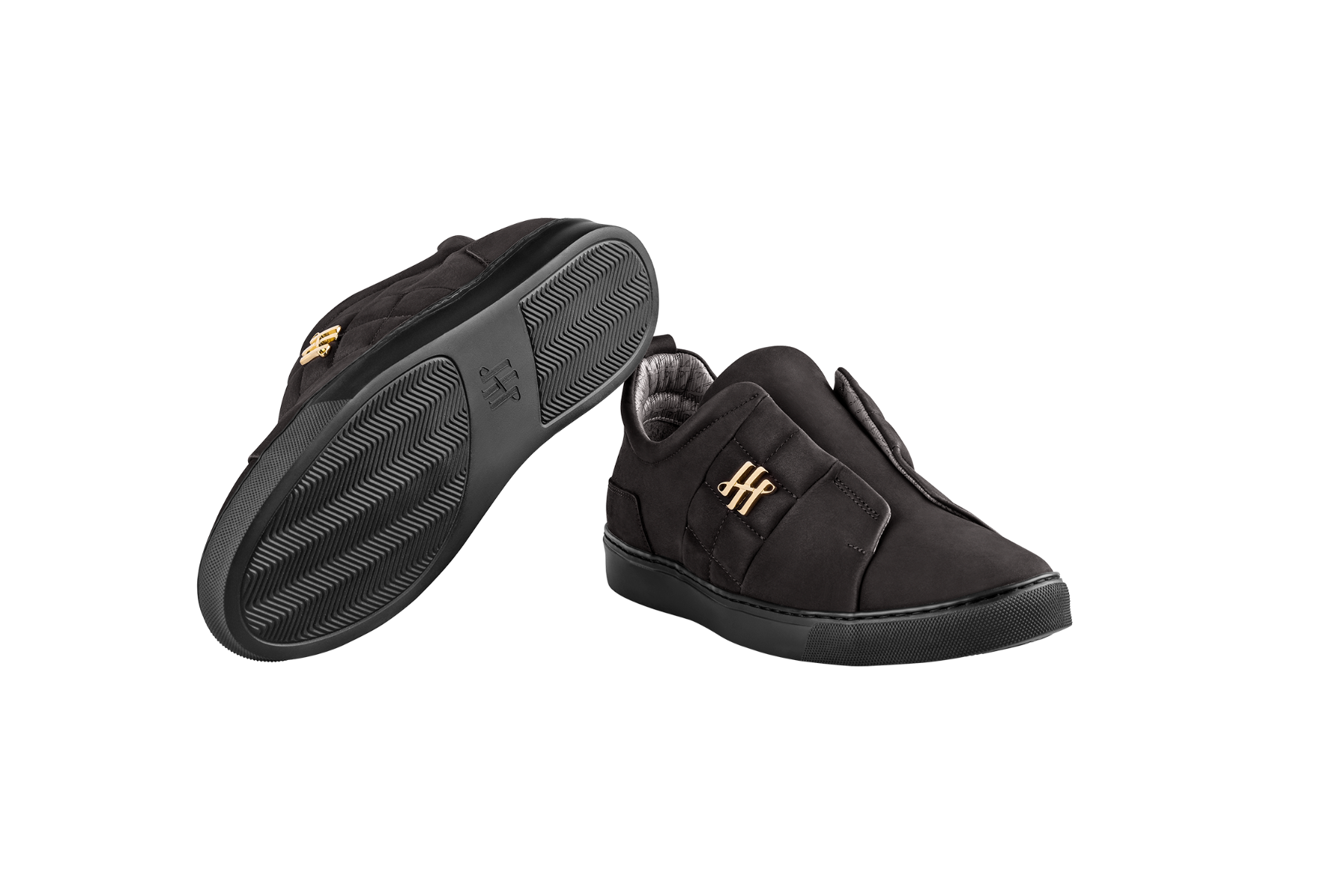 Handcrafted footwear produced in Veneto (Italy), LWG-certified calfskin, Montegrappa Ambigram in 24K gold-plated brass, matelassé motif, hidden internal elastics, EVA sole, tailored stitching, padded collar with Ambigram motif, removable Fussbet insole, embossed and stitched logo, 100% Made in Italy