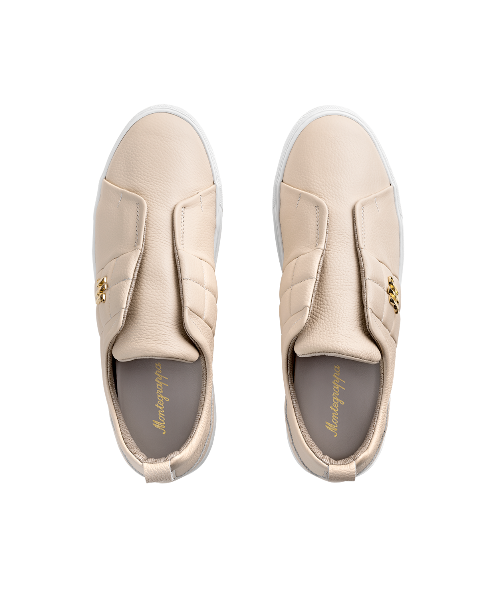 Handcrafted in Italy from tumbled calfskin, LWG certified, the Gold Edition sneakers combine premium materials with details that catch the light. The Montegrappa Ambigram in brass, finished with 24-carat gold plating, marks the shoe as an expression of craftsmanship, individualism, and flair.