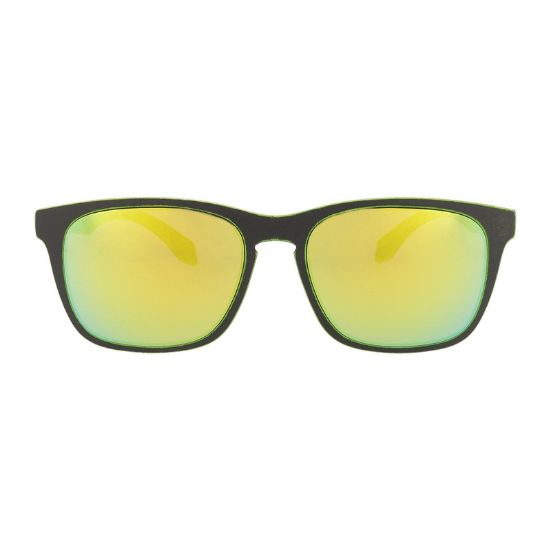 Unisex sport sunglasses with black frame finished with a lime border and yellow-green mirrored lenses.