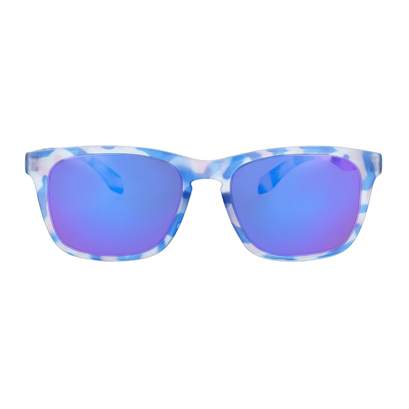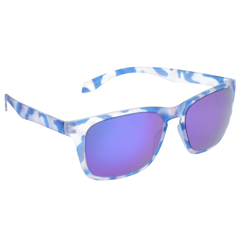 Unisex sport sunglasses with blue camo frame and blue mirrored lenses.