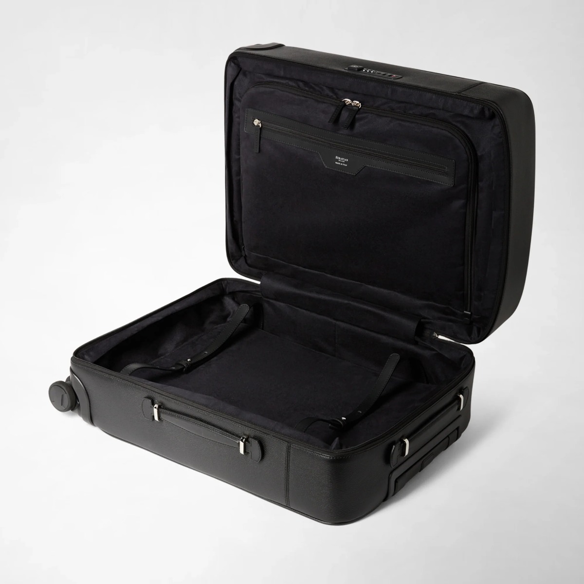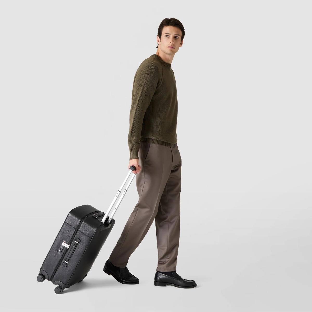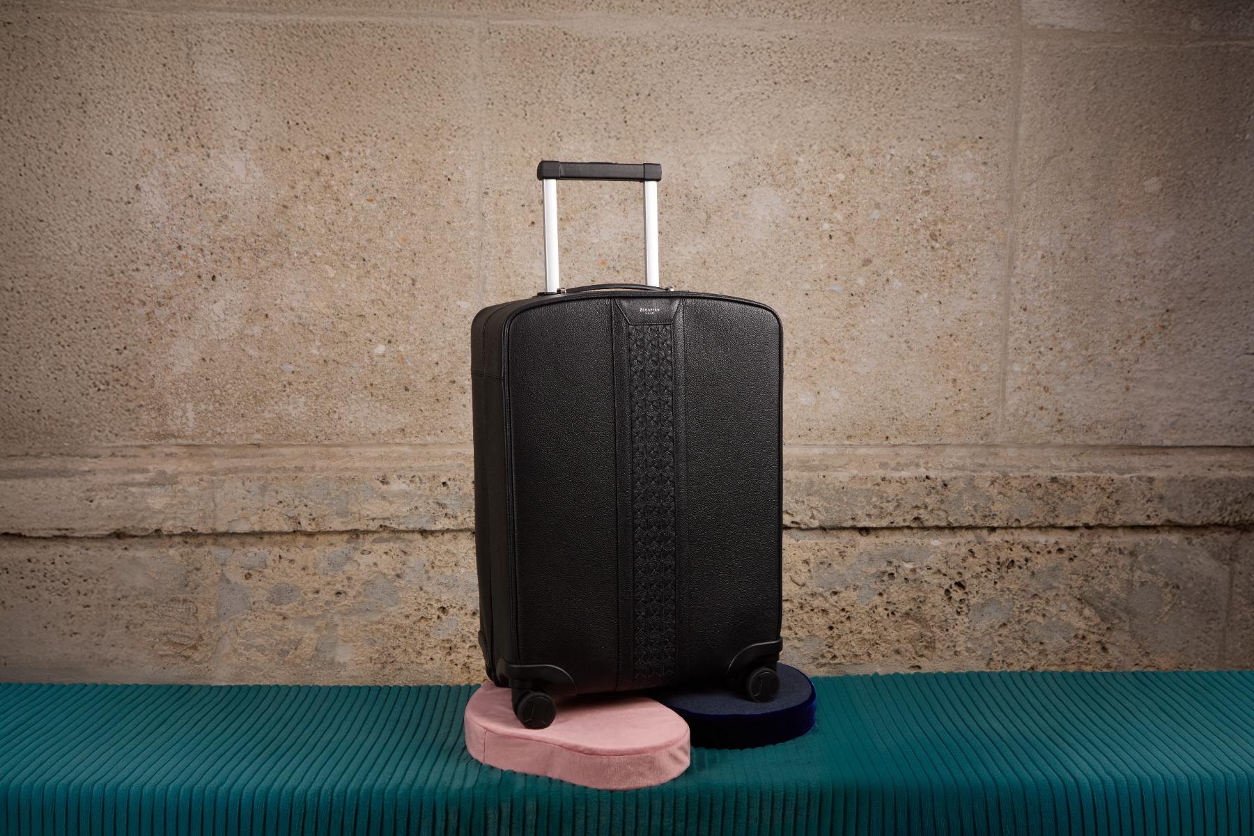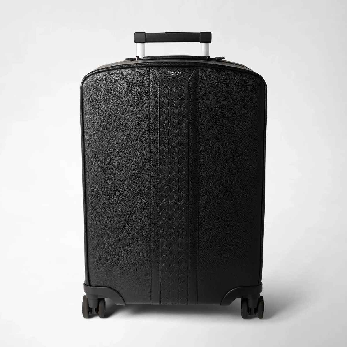 Whether travelling for business or pleasure, the functional Carry-On Suitcase in Black Cachemire leather with Mosaico detail will ensure you arrive in style. Blending traditional craftsmanship and innovation, this creation is crafted from Cachemire leather, an exclusive naturally tumbled calfskin leather that is as smooth as the finest cachemire and features a Mosaico detail: an exclusive Serapian craft since 1947. The roomy interior is designed to keep everything safely stored during your journey, while the four-wheel construction ensures it glides smoothly across all surfaces.