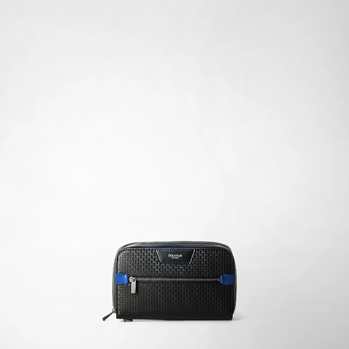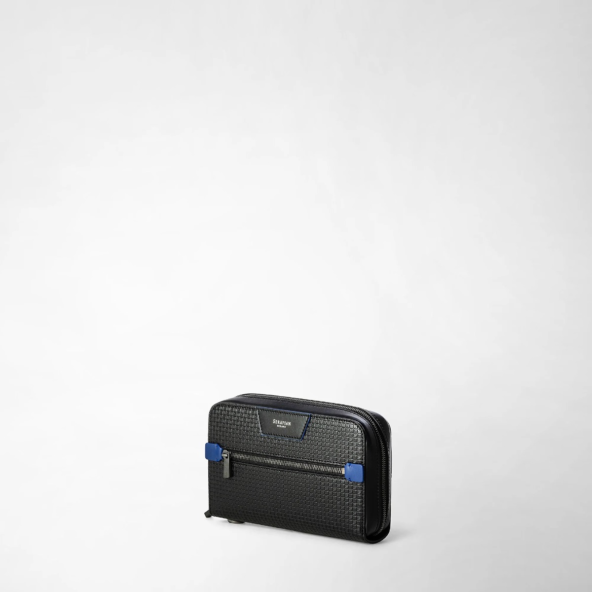 The Clutch in Black Stepan with Winter Blue leather details is the ideal companion for meetings and business trips. With its practical shape and spacious interior, it features pockets to keep all your essentials, devices, and documents neatly organized. It effortlessly adapts itself to the round-the-clock agenda of the modern businessman. Created to stand the test of time, it is made from Stepan-coated canvas, a sturdy and water-resistant material with an all-over S-etching detail. Originating from the far-sighted vision of Ardavast Serapian, Stepan was first trademarked in the mid-seventies and remains an exclusive house emblem.