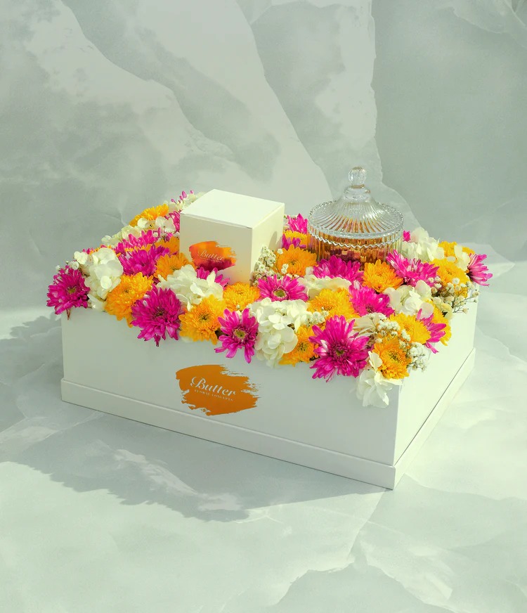 A gift that will instantly spread love, light, and warmth through the aromatic fragrance of white hydrangeas & striking yellow & fuchsia chrysanthemums. Includes Butter’s signature vanilla Patchouli candle and a crystal glass serving bowl with nuts.