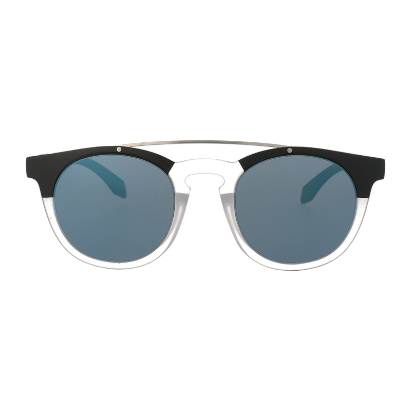 Unisex fashion sunglasses with black/transparent frame with silver bridge and mirrored blue lenses.
