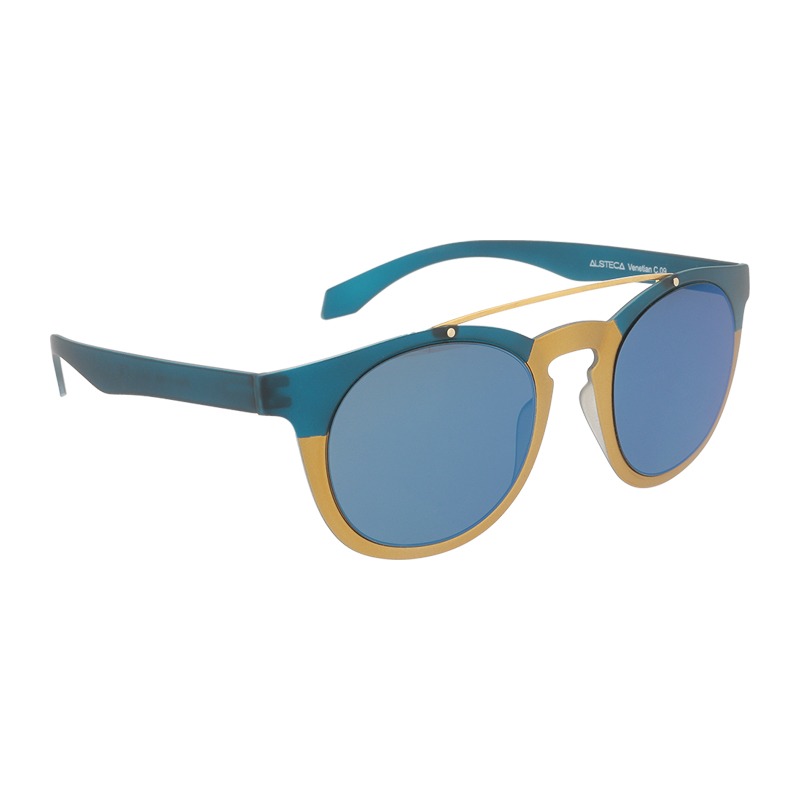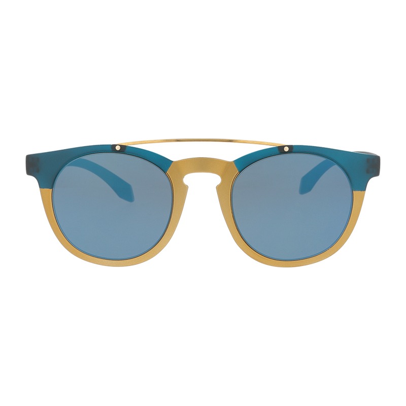 Unisex fashion sunglasses with petrol blue/gold frame with gold bridge and mirrored blue lenses.