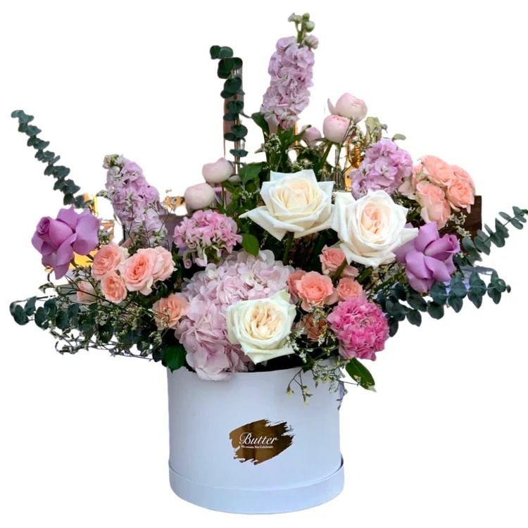A wild arrangement of fully bloomed flowers giving it a grand & larger than life look. O'hara roses, mathiola, hydrangeas, baby peonies & baby roses blooming stunningly between fragrant eucalyptus. Perfect for gifting & for a statment piece in your home. Originally designed for Galleries Lafayette Dubai.
