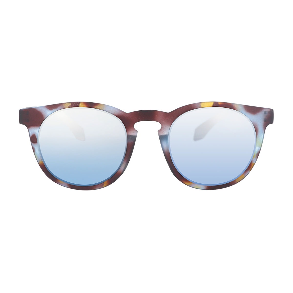 Unisex fashion sunglasses with light blue camo frame finished with a special metallic champagne effect and light blue mirrored lenses.