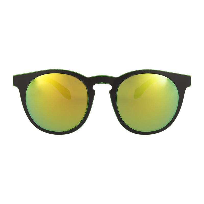 Unisex fashion sunglasses with black frame finished with yellow borders and yello-green mirrored lenses.