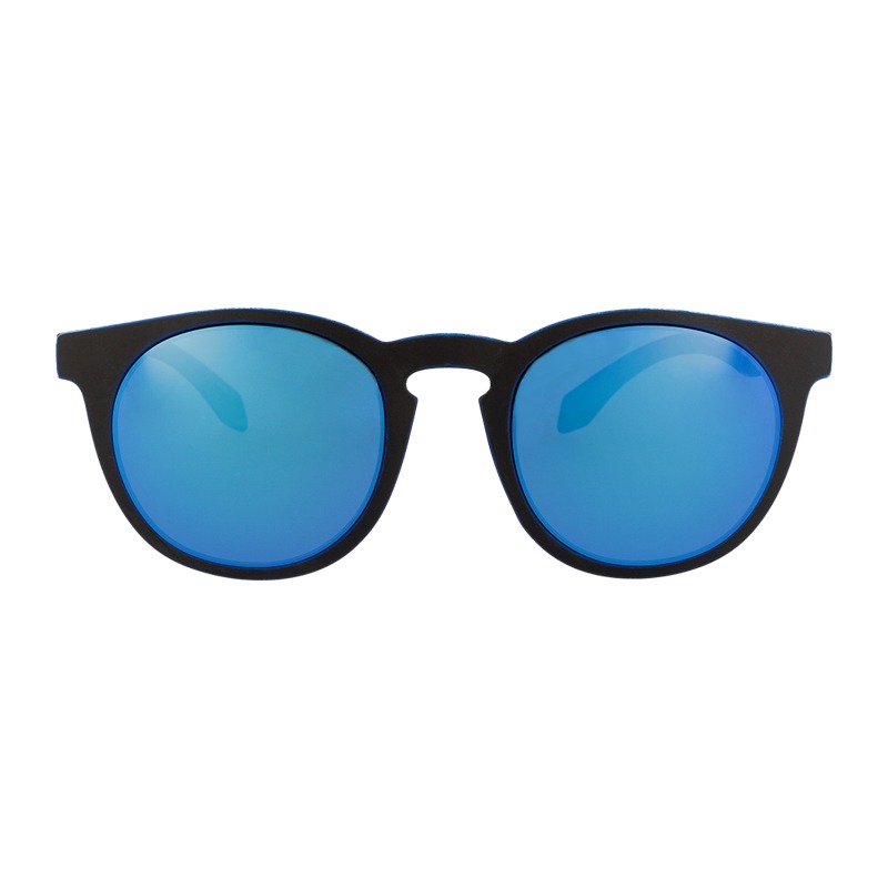 Unisex fashion sunglasses with black frame finished with a blue border and blue mirrored lenses.