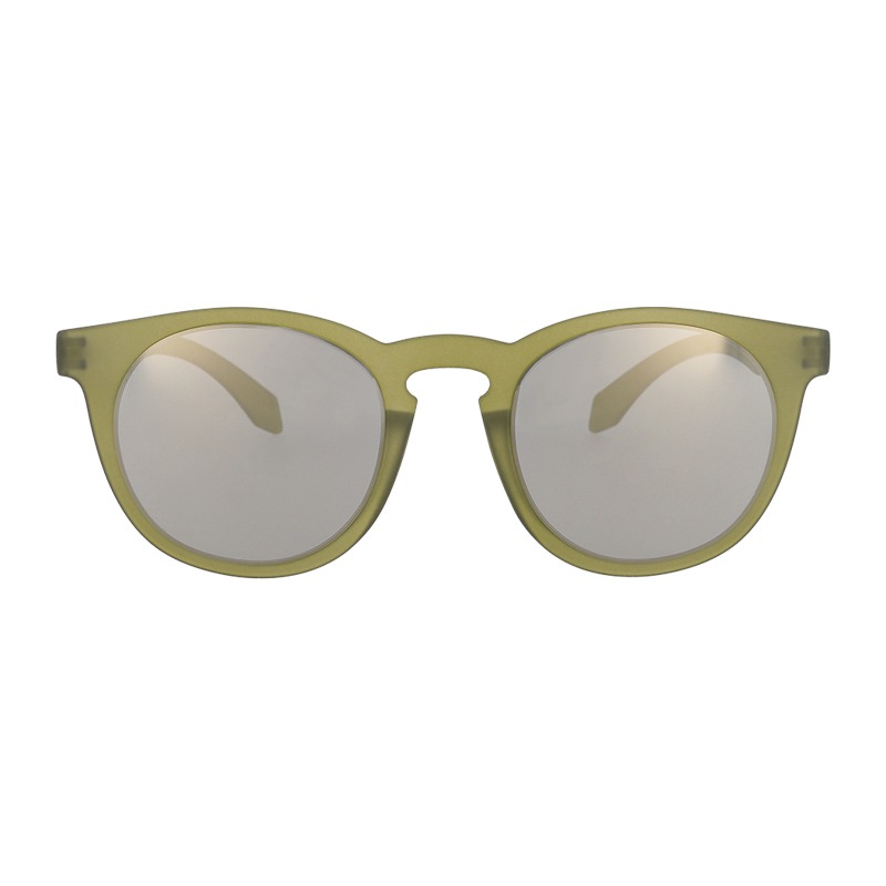 Unisex fashion sunglasses with green transparent frame and grey lenses with a gold mirror coating.