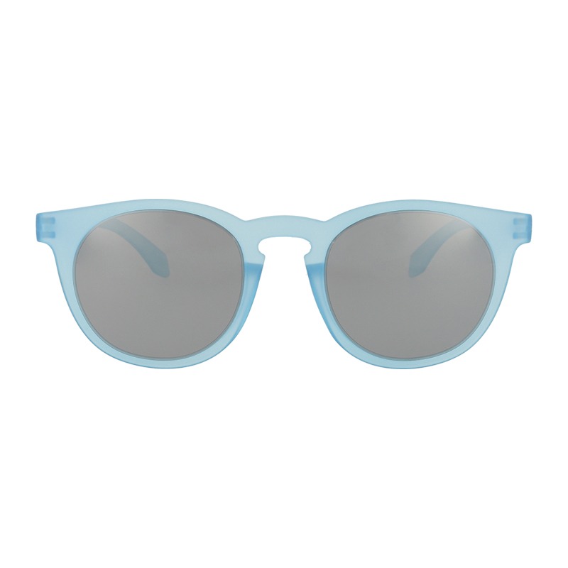 Unisex fashion sunglasses with transparent blue frame and grey lenses with a silver mirror coating.